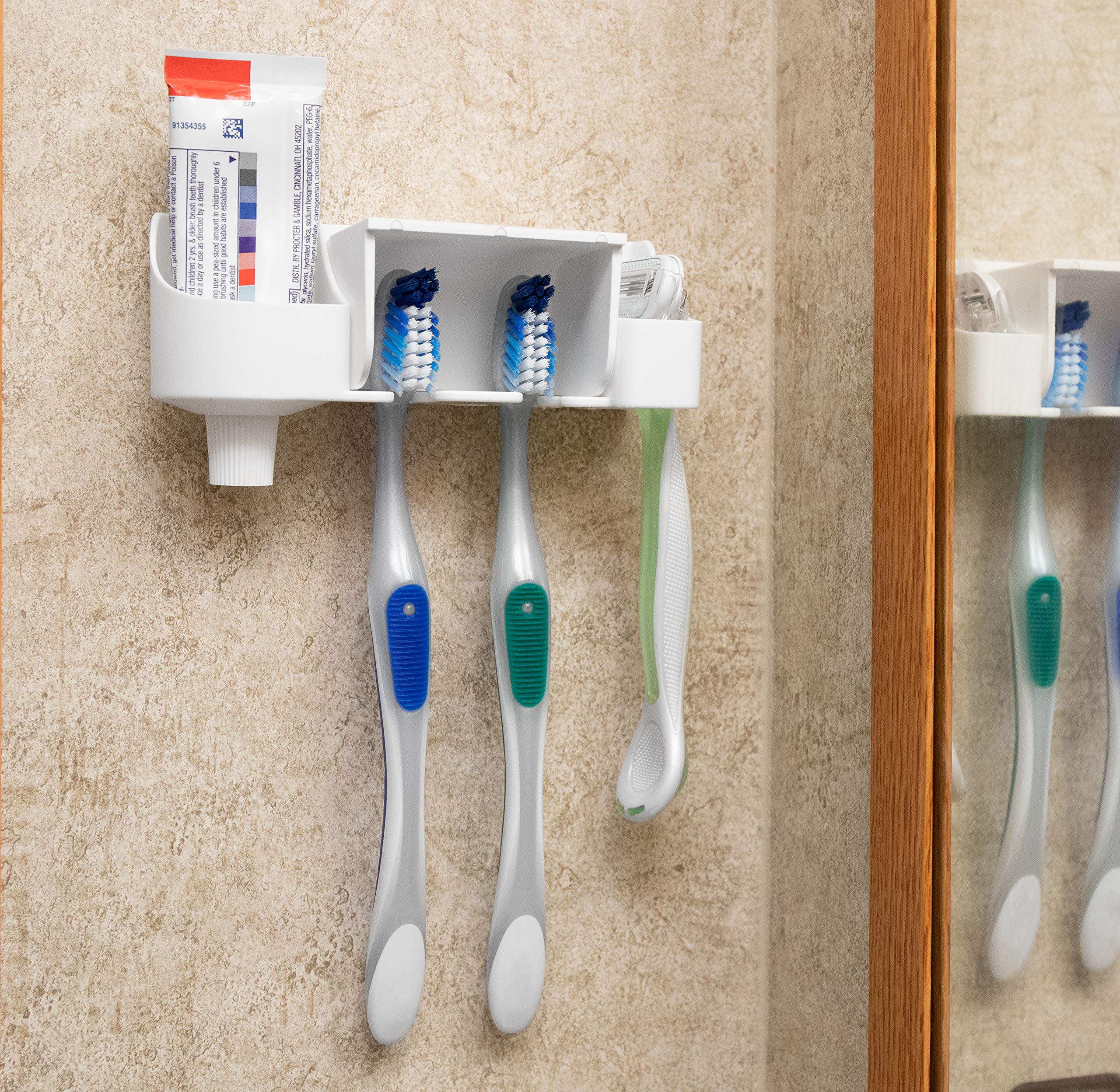 - The Perfect Bathroom Organizer: Holds (2) toothbrushes, a tube of small toothpaste and either floss or a small razor
