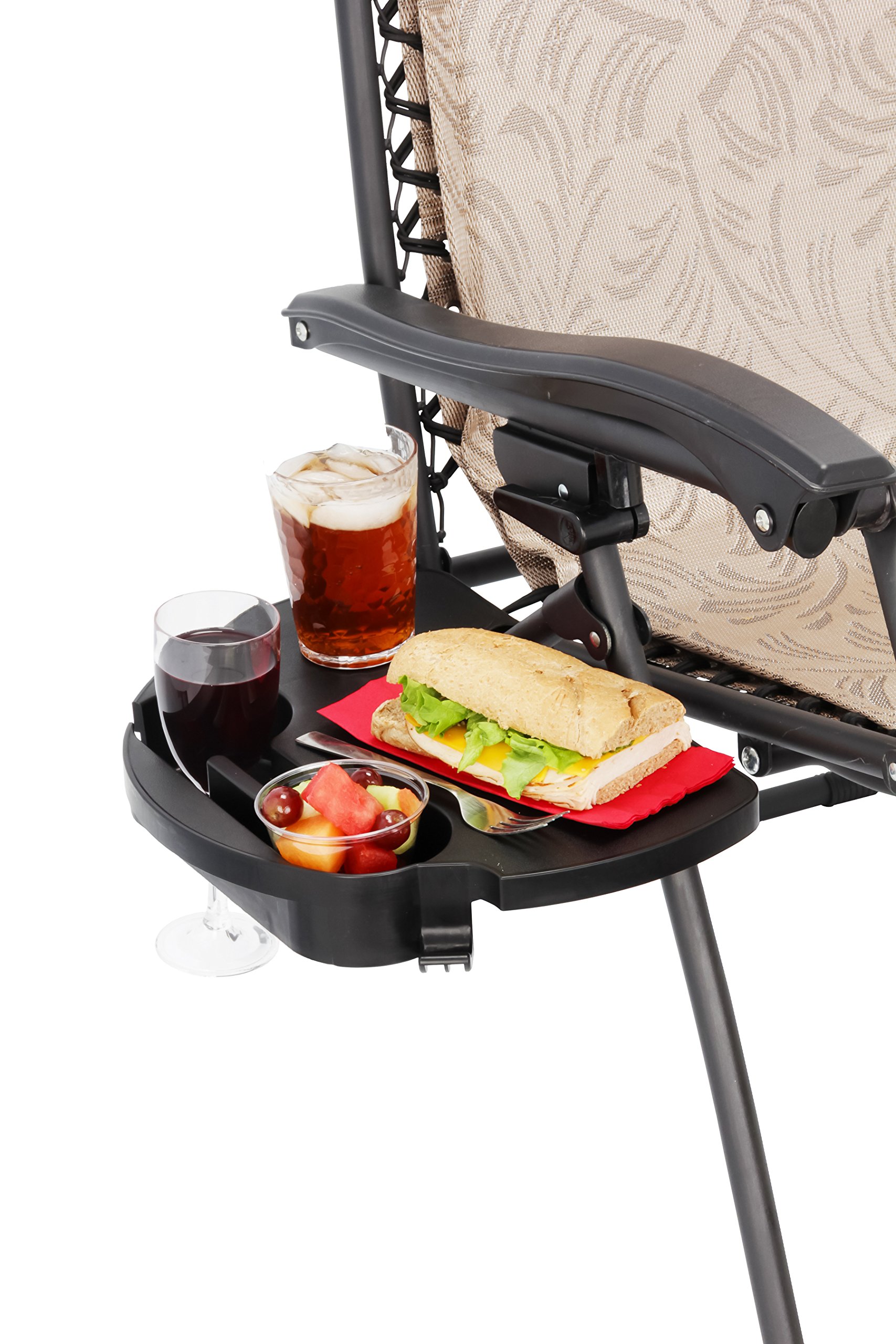 Camco Zero Gravity Chair Tray – Clip‑On Side Table w/Cup Holders, Stemmed Glass Slot, Non‑Slip Textured Surface, Drainage Holes & Bag Hook – Fits up to 7/8” Frames – Durable Polymer, Black (51834)